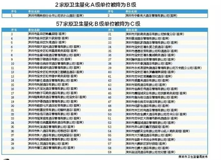 5、深圳市衛(wèi)生監(jiān)督部門自2018年12月開始集中開展專項(xiàng)整治行動(dòng)。截至目前,行動(dòng)中共檢查1660家酒店業(yè)單位,責(zé)令限期整改224家,立案95宗,共有59家單位在衛(wèi)生信譽(yù)等級(jí)評(píng)定復(fù)審工作中被予以“降級(jí)”,其中不乏部分知名連鎖酒店業(yè)單位。