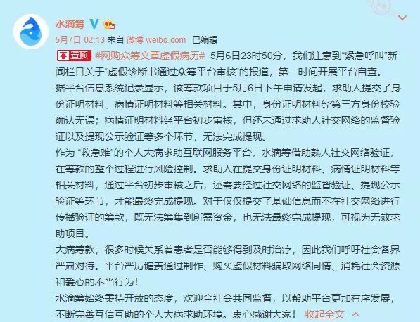 水滴籌官方微博稱,據(jù)平臺信息系統(tǒng)記錄顯示,記者提交的虛假眾籌款項(xiàng)目于5月6日下午申請發(fā)起,求助人提交了身份證明材料、病情證明等相關(guān)材料。