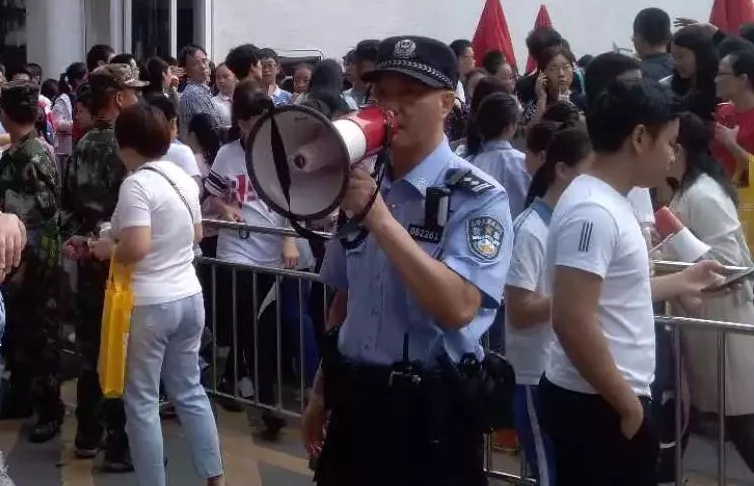 當天在蜂擁的人群中,有一個人在家長群里火了,視頻里他身穿警服,拿著喇叭在現(xiàn)場維持秩序。