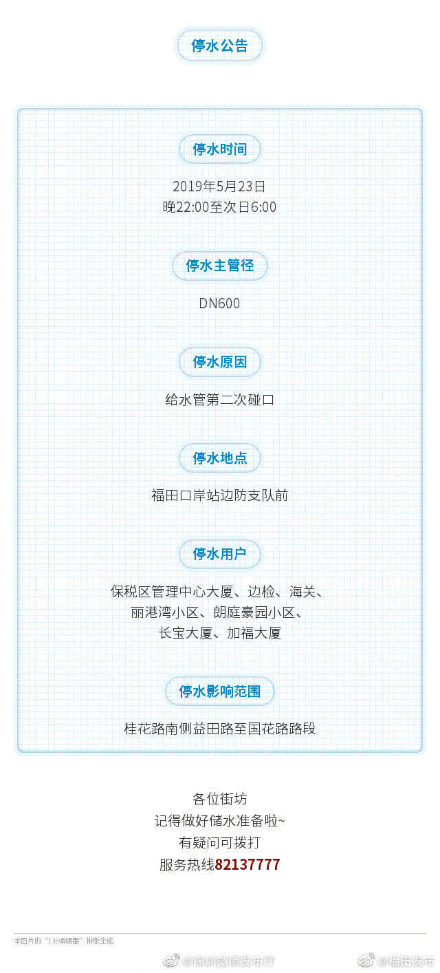 溫馨提醒!今天晚上22:00至明日6:00,福田區(qū)保稅區(qū)管理中心大廈、邊檢、海關(guān)、麗港灣小區(qū)、朗庭豪園小區(qū)、長寶大廈、加福大廈等區(qū)域?qū)⒂媱澩K?,各位街坊記得做好儲水準備??!戳下圖了解更多停水停電資訊!