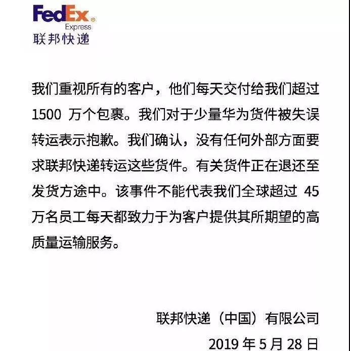 聯(lián)邦快遞(中國)公司28日在其社交媒體官方賬號(hào)稱,“我們對(duì)于少量華為貨件被失誤轉(zhuǎn)運(yùn)表示抱歉。我們確認(rèn),沒有任何外部方面要求聯(lián)邦快遞轉(zhuǎn)運(yùn)這些貨件。有關(guān)貨件正在退還至發(fā)貨方途中?!?/p>