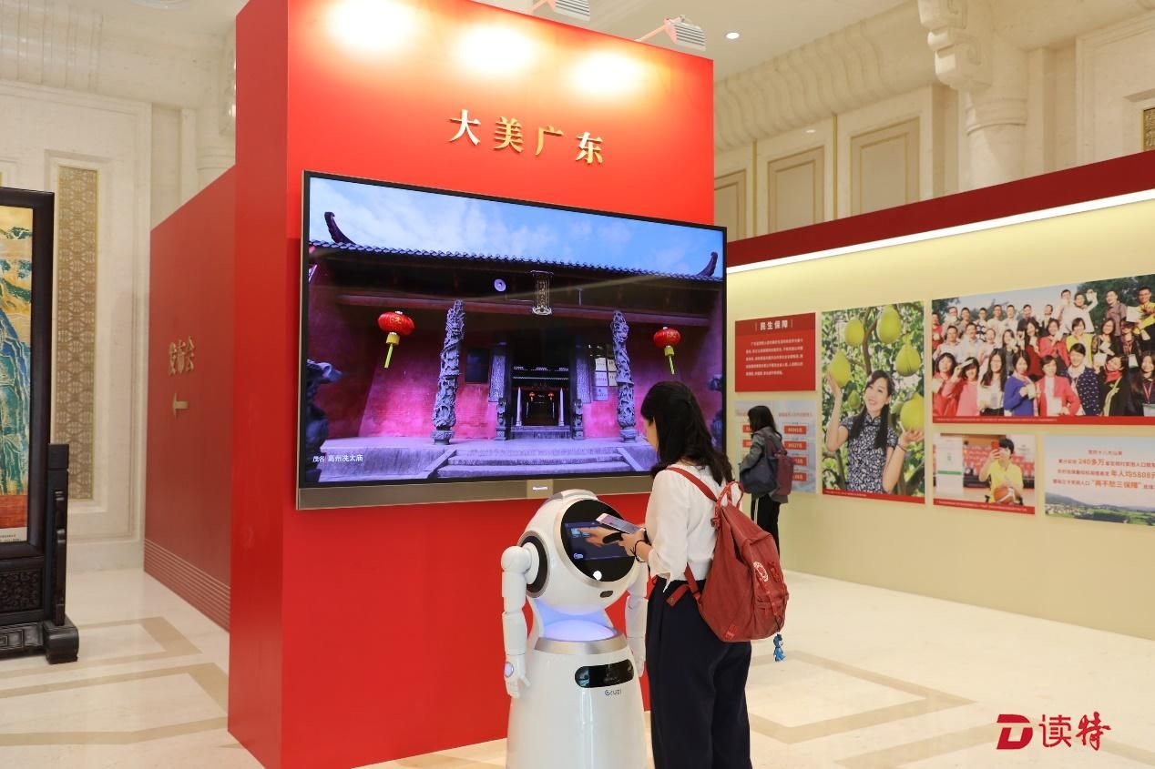 新中國(guó)成立70周年廣東省成果展入口處克魯澤提供智能迎賓服務(wù)。