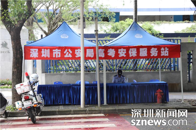 在深圳實驗中學(xué)中學(xué)部考點外,深圳市公安局設(shè)置有高考安保服務(wù)站