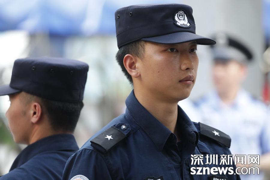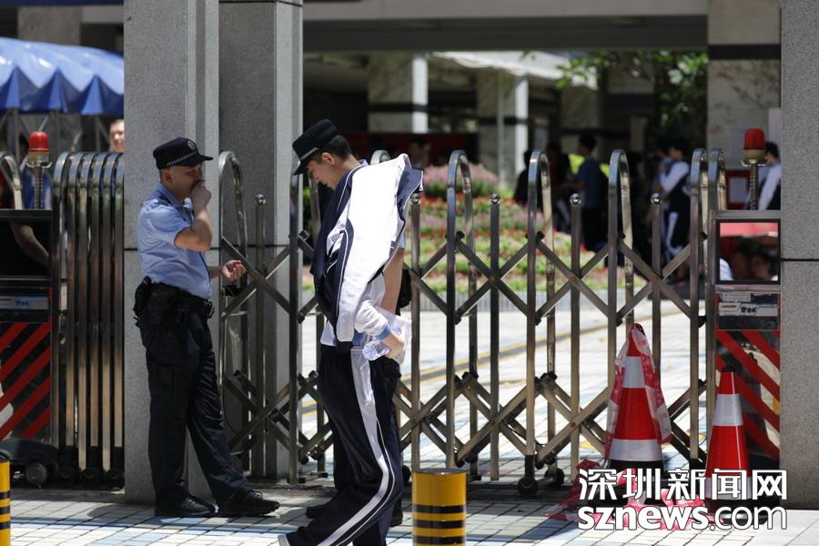 深圳實驗中學考點外,高考保障人員正在執(zhí)勤