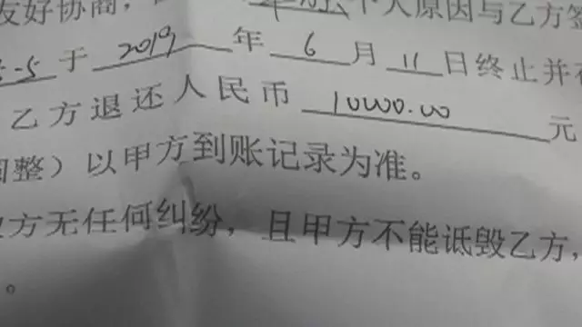 單先生出示了雙方簽的協(xié)議,雙方于6月11日解約,乙方拍賣公司退還甲方單先生1萬元,“雙方無任何糾紛,甲方不得詆毀乙方”。公司另外補償?shù)?000元沒寫在協(xié)議上,但已經(jīng)打到單先生妻子賬戶上。