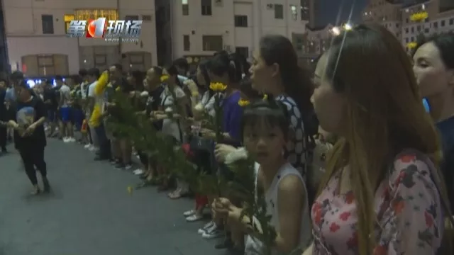 晚上7點30分,大家在有序組織下,排成一隊,逐一走到花籃前,放下手中的鮮花,雙手合十,并鞠躬致意。