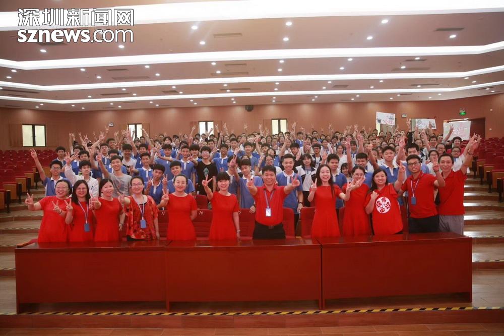 龍華區(qū)實(shí)驗(yàn)學(xué)校的老師以及學(xué)生合影打氣,圖片攝于21日,由龍華區(qū)實(shí)驗(yàn)學(xué)校的何小波老師提供。