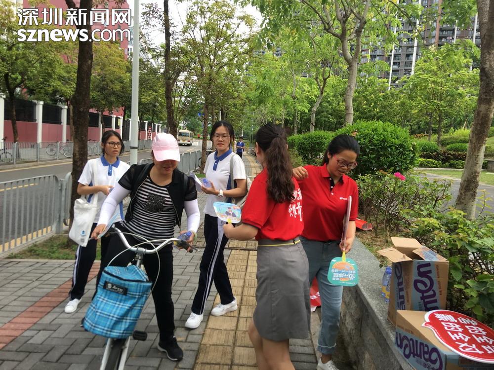 記者在深圳高級(jí)中學(xué)(集團(tuán))北校區(qū)校門口看到,有家長(zhǎng)、老師及教育機(jī)構(gòu)自發(fā)組織到考場(chǎng)外,為考生提供送水、接送等服務(wù)。據(jù)了解,他們是來(lái)自龍華區(qū)實(shí)驗(yàn)學(xué)校和深圳高級(jí)中學(xué)(集團(tuán)北校區(qū))的老師和考生家長(zhǎng)。