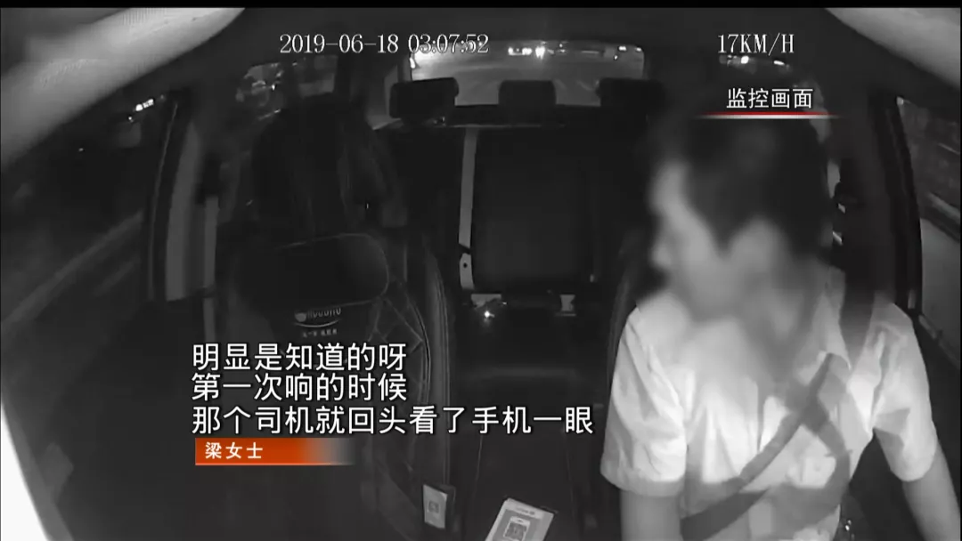 梁女士說(shuō),司機(jī)調(diào)大車內(nèi)聲音后,手機(jī)鈴聲還一直在響,閃光燈也一直在閃。在這期間士司機(jī)仍然有回頭查看的舉動(dòng)。3點(diǎn)09分,的士司機(jī)靠邊停了車,監(jiān)控顯示他在打電話。15分鐘后,一名男性乘客上了車。