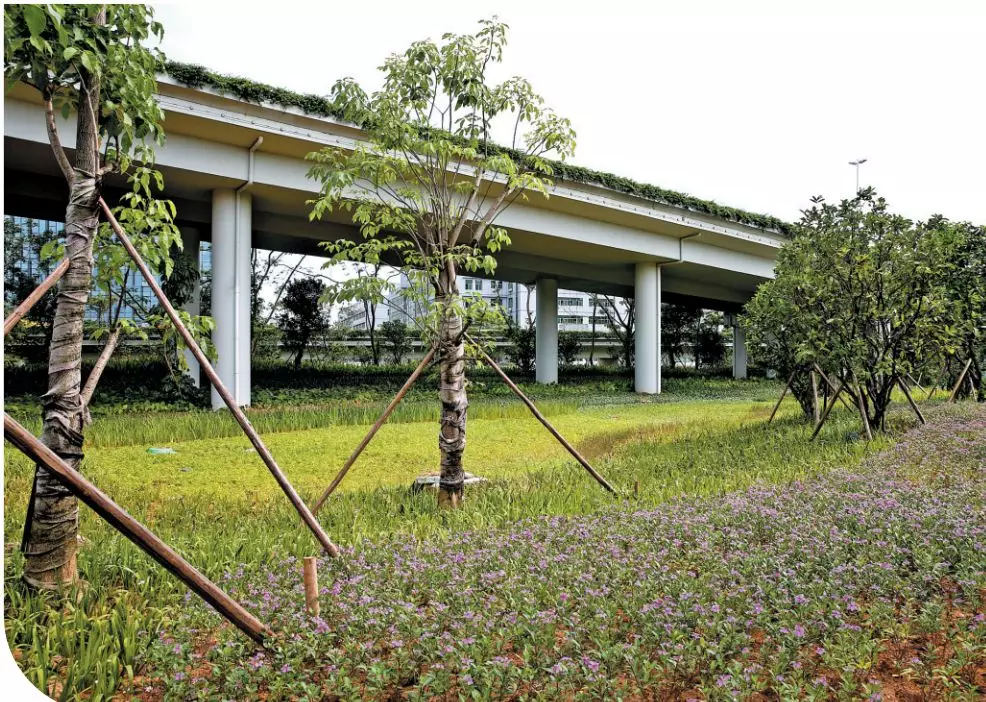 該工程將生態(tài)植草溝、生物滯留設施、溢流式雨水口、透水鋪裝、雨水檢查井與自然生態(tài)、園林景觀完美融合。