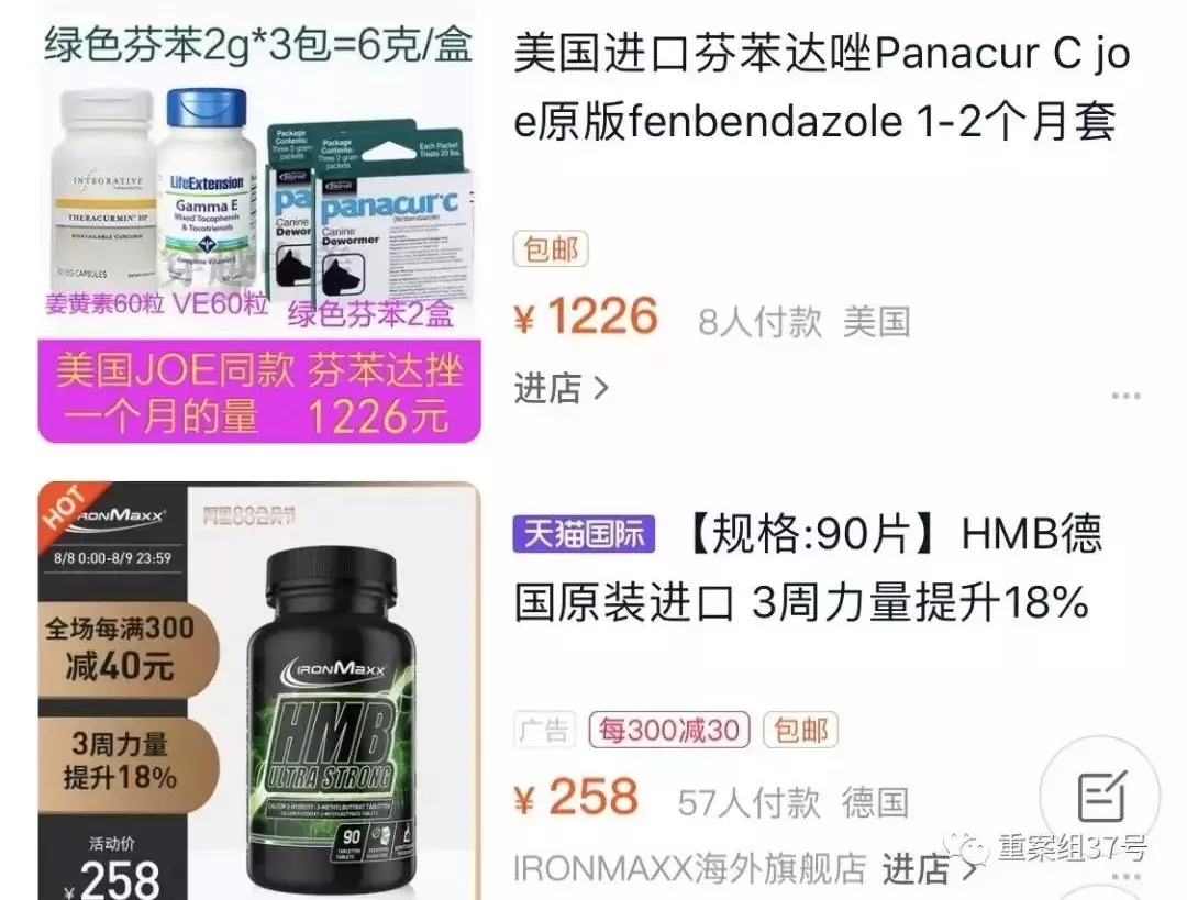 事情發(fā)展到現(xiàn)在,已經(jīng)有人在網(wǎng)上做起這門生意。在電商平臺搜索可見,不少商家打出“喬伊套餐”等招牌售賣芬苯達(dá)唑,自稱是按美國患者喬的配方搭配,但如此一來,原本20多元一瓶的藥,搭配后就要賣800元左右。