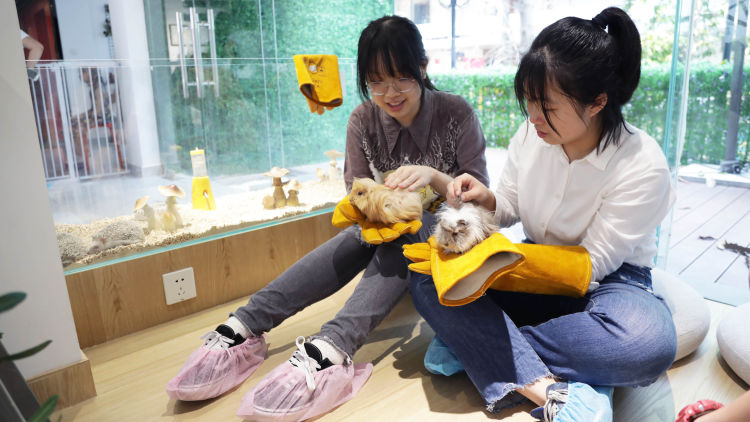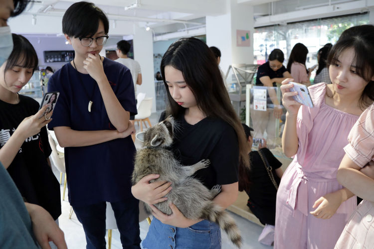除了小動(dòng)物和飼養(yǎng)員們,這里還聚集了許多年輕女孩兒,她們有的相互認(rèn)識(shí),輪流跟店里的小浣熊撓癢癢拍照;有的不認(rèn)識(shí)彼此,卻因?yàn)轱曫B(yǎng)過同樣的小動(dòng)物而熟絡(luò)起來,相互傳授養(yǎng)育自家"孩子"的經(jīng)驗(yàn)。這只名為"六一"的小浣熊是這里的常駐小動(dòng)物,面對(duì)市民們的熱情,"六一"毫不客氣地躺在小姐姐的臂彎里撒嬌,引來其他市民們爭(zhēng)相拍照。