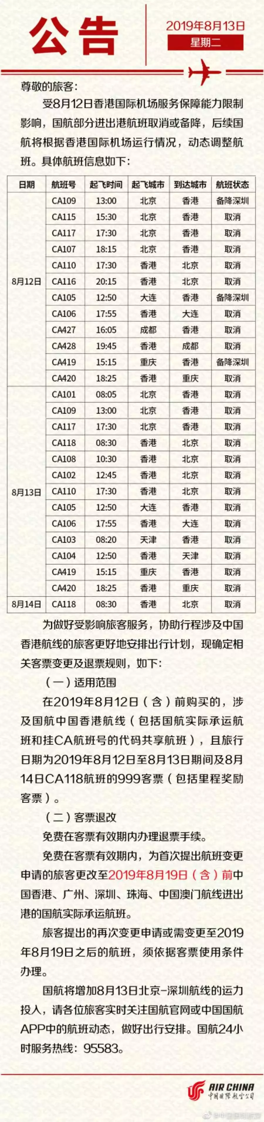 今晨,中國國際航空公司官方微博發(fā)布公告稱,受8月12日香港國際機場服務(wù)保障能力限制影響,國航部分進出港航班取消或備降,后續(xù)國航將動態(tài)調(diào)整航班。