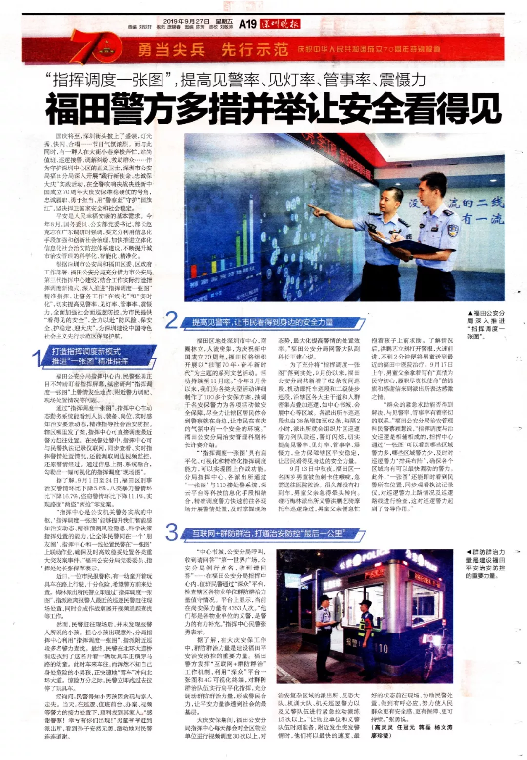 國慶將至,深圳街頭披上了盛裝,燈光秀、快閃、合唱……處處喜氣洋洋,節(jié)日氣氛濃烈。在這鮮艷亮麗的平安底色下,有一群人在大街小巷穿梭奔忙,站崗值班、巡邏接警、調(diào)解糾紛、救助群眾……作為守護深圳中心區(qū)的正義衛(wèi)士,深圳市公安局福田分局深入開展“踐行新使命、忠誠保大慶”實踐活動,在全警吹響決戰(zhàn)決勝新中國成立70周年大慶安保維穩(wěn)硬仗的號角,忠誠履職、勇于擔(dān)當(dāng),用“警察藍”守護“國旗紅”,努力營造平安祥和歡樂的節(jié)日氛圍,堅決捍衛(wèi)國家安全和社會穩(wěn)定。