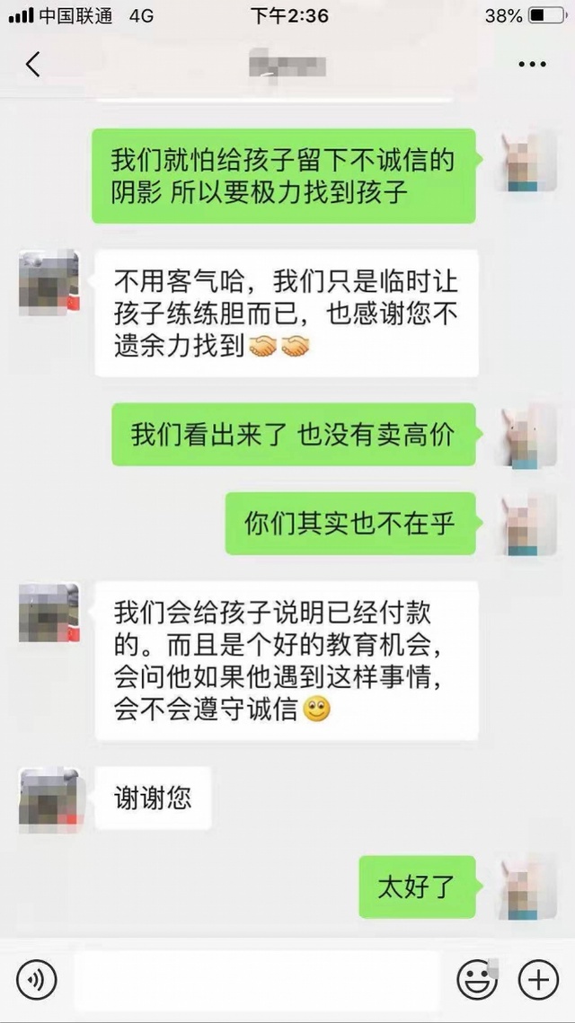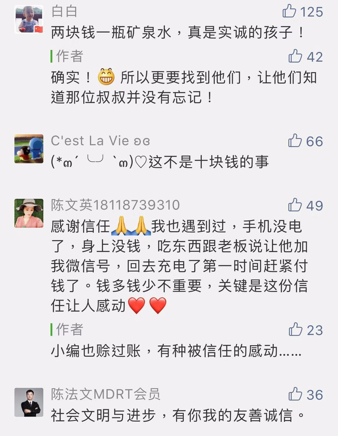 賣水男孩爸爸告訴張先生,他是從朋友的轉(zhuǎn)發(fā)中,看到這個(gè)消息的。他介紹說,他們那天只是臨時(shí)讓孩子練練膽,并對張先生努力尋找孩子,實(shí)現(xiàn)對孩子承諾的誠信行為表示感謝?!拔視o孩子說明已經(jīng)付款的,而且這是個(gè)好的教育機(jī)會,我會問他,如果他遇到這樣的事情,會不會遵守誠信。”賣水男孩爸爸告訴張先生,“沒有想到你為了守護(hù)一份誠信,借助網(wǎng)絡(luò)媒體的力量,花大力氣尋找并支付礦泉水錢,這份堅(jiān)持,讓我們和孩子都非常感動。我們也已經(jīng)與孩子溝通整件事情,并借此機(jī)會告訴他換位思考,如果遇到類似情況,也應(yīng)堅(jiān)持誠信、與人為善的傳統(tǒng)美德。”