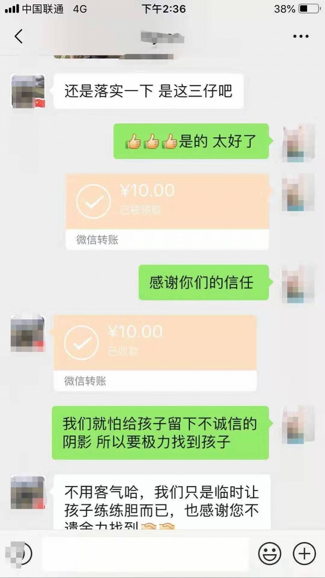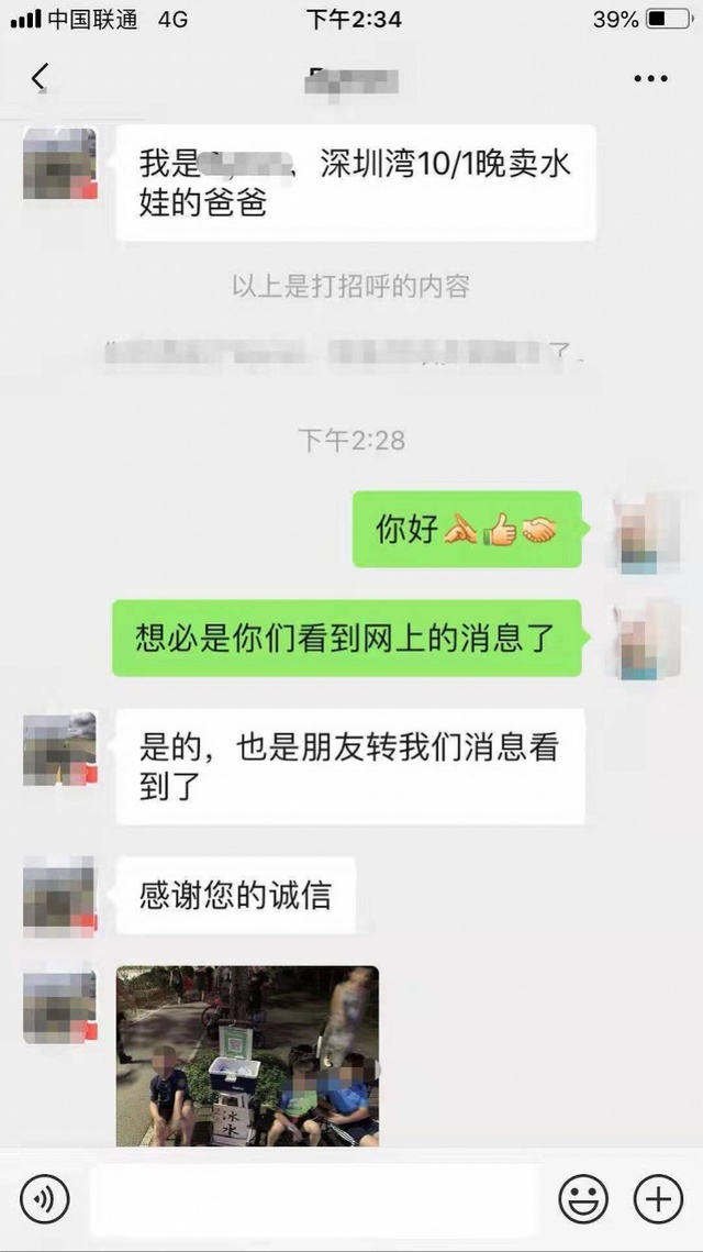 4日,剛從深圳返回青島的張先生告訴記者,中午2時(shí)35分,他的微信出現(xiàn)一個(gè)新增好友,對方說自己是深圳灣10月1日晚賣水男孩的爸爸,張先生立刻把對方加為好友。賣水男孩爸爸通過微信給張先生發(fā)來一張照片,是國慶當(dāng)晚孩子在路邊賣水時(shí)拍的,讓張先生確認(rèn)一下是不是照片上的孩子?!笆撬麄?,太好了,終于找到了。”張先生隨即通過微信轉(zhuǎn)賬10元錢過去,賣水男孩爸爸也收款成功。(此前報(bào)道:緊急尋人!深圳灣畔的賣水孩子,青島大叔在找你…)