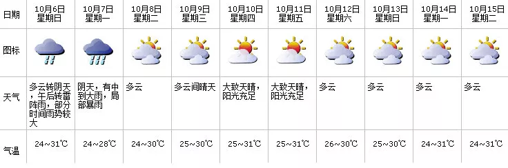 今明兩日有中到大雨,局部暴雨,降雨集中在6日午后至7日上午,部分時(shí)間伴有雷暴,沿海和高地陣風(fēng)6-8級,6日氣溫24-31℃;8-11日多云到晴天;12日有小雨。假期返程高峰期有明顯降雨和大風(fēng),請加強(qiáng)海上活動和道路交通安全的管理。