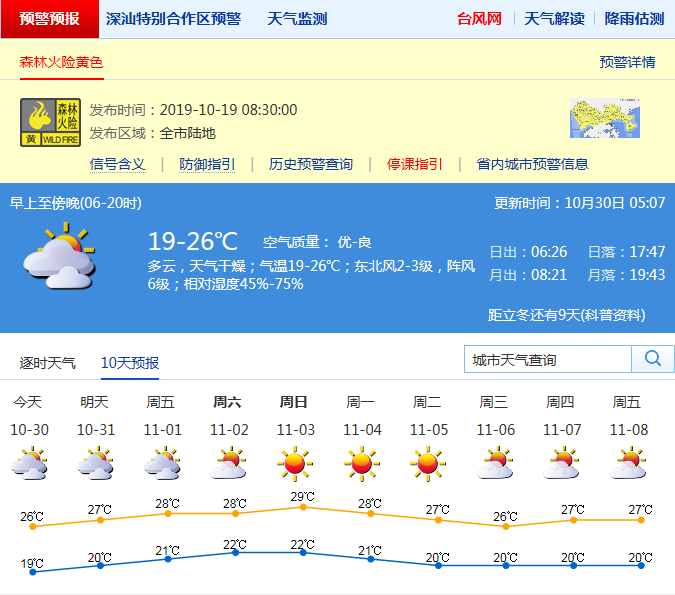 見(jiàn)圳客戶端·深圳新聞網(wǎng)2019年10月30日訊 深圳市氣象局預(yù)計(jì)30-31日多云間晴天,空氣干燥,氣溫19-26℃,早晚較涼;受冷空氣和熱帶低壓共同影響,30-31日沿海、高地和海區(qū)陣風(fēng)6-7級(jí)。11月1-5日晴天間多云,晝夜溫差加大,空氣持續(xù)干燥。