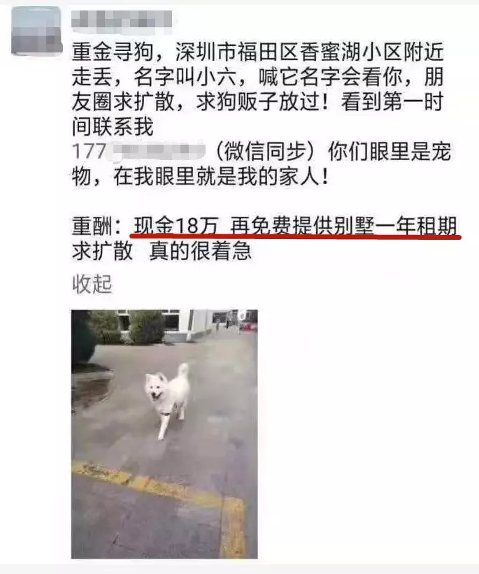 深廣電第一現(xiàn)場(chǎng)2019年11月19日訊 近日,一張“重金尋狗”的朋友圈截圖火了!一位狗主人的朋友圈寫(xiě)道:狗狗“小六”在福田區(qū)香蜜湖小區(qū)附近走丟,喊它名字會(huì)看你,朋友圈求擴(kuò)散,求狗販子放過(guò)!如果幫忙找回重酬現(xiàn)金18萬(wàn),再免費(fèi)提供別墅一年租期。