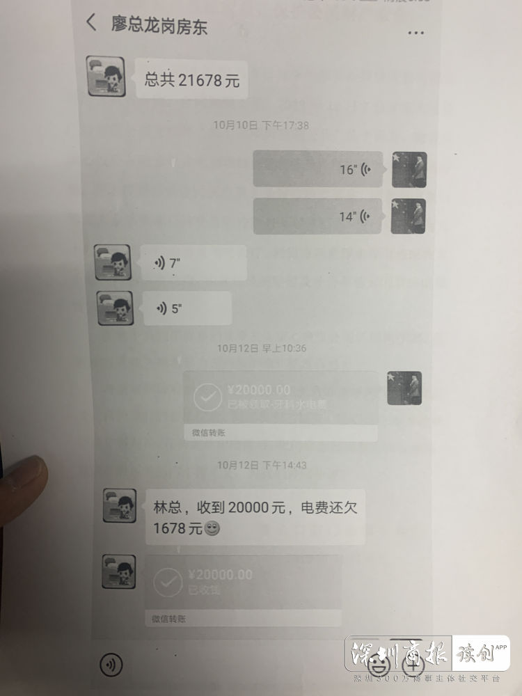 今年10月18日,廖遠林突然給林女士發(fā)律師函,以拖欠房租為由解除合同。林女士提供的一份微信截圖顯示,在對方發(fā)函6天前,林女士給廖遠林轉(zhuǎn)賬2萬元水電費,稱電費還欠1678元。林女士強調(diào),廖遠林收了他們水電費后便立馬退群,自此以后她們再難聯(lián)系上他。