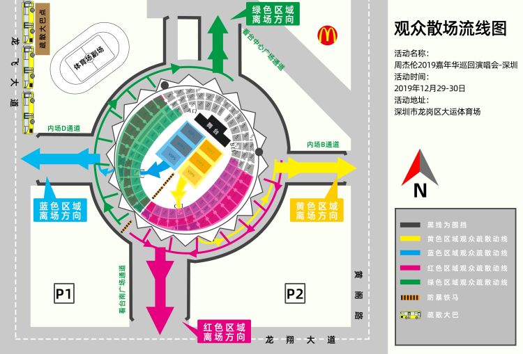 由于大運地鐵站近期正值維修狀態(tài),出入站不便,建議市民演唱會結束后選擇愛聯(lián)站乘坐地鐵,地鐵3號線將臨時延長收車時間,其中愛聯(lián)站末班車23:39,大運站末班車23:42。同時承辦方每天安排380輛(300輛停放在龍飛大道、80輛停放在龍城晨光路)疏散大巴用于演唱會結束后疏散觀眾。演唱會結束后,一是請前往羅湖區(qū)大劇院、福田區(qū)車公廟、南山區(qū)世界之窗市民在龍飛大道依次等候,大巴客滿出發(fā)后不返回大運中心;二是請前往地鐵3號線愛聯(lián)站市民在青春路依次等候,大巴客滿出發(fā)后不返回大運中心,具體如下: