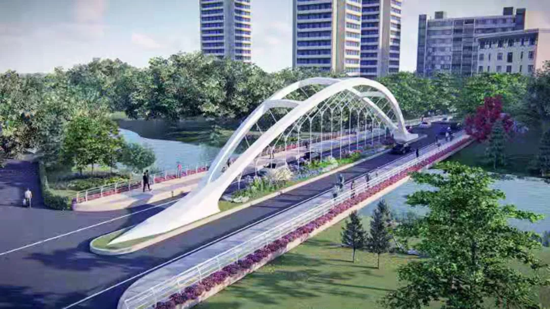 據(jù)介紹,凌菊路跨大沙河橋主體結構需與大沙河生態(tài)長廊同步建設,項目工期緊、任務重。根據(jù)相關規(guī)定,橋梁在河中不能設支墩,與大沙河河道需滿足2.5m的凈高要求,橋梁跨度大。最終,該項目采用下承式拱結構鋼橋,鋼結構橋梁可在工廠提前預制,運輸至現(xiàn)場安裝,解決了技術和工期緊等難題。