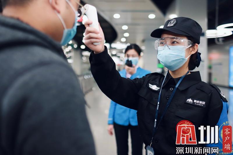 在深圳機(jī)場(chǎng),工作人員對(duì)往來(lái)乘客進(jìn)行體溫檢測(cè)。