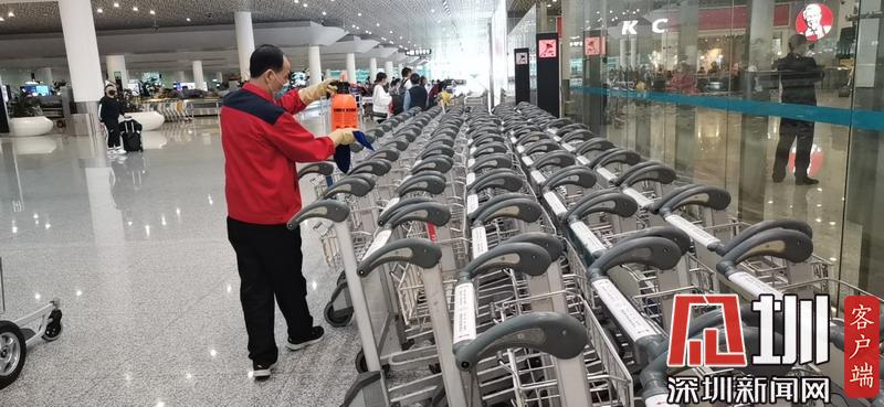 深圳機(jī)場(chǎng)工作人員對(duì)行李推車(chē)進(jìn)行消毒。