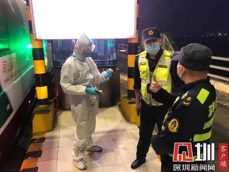 26日下午深圳黃鶴收費(fèi)站,深圳交警對(duì)往來(lái)司機(jī)進(jìn)行體溫檢測(cè)。
