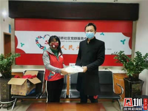 ▲黃志?。ㄓ遥┵浰土?00只醫(yī)用口罩支援東湖街道防控一線。