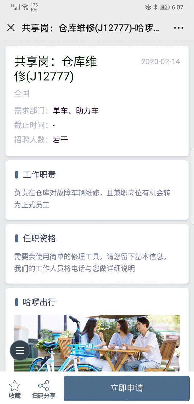 據(jù)了解,共享騎行的運維工作有非常大的靈活性:一、根據(jù)崗位職能的不同,運維每天的工作時間較靈活。如車輛調(diào)度人員,可以只在城市的上下班高峰期前后工作;二,工作形式上可以有比較大的靈活性。如哈啰的“單車獵人”,他的職能是在城市各個角落尋找因騎行超區(qū)失聯(lián)的單車、助力車;三,哈啰出行及哈啰的第三方人力公司,可以為這些崗位提供較為靈活的結薪方式,通過綠色通道可以做到按周或雙周結薪。待原崗用工恢復,共享崗位員工可隨時返回。