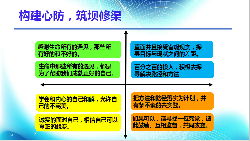 所有的消極情緒都是外面?zhèn)鬟f進來的,而所有的積極情緒都是自己構建的,面對消極情緒,我們要相信自己,通過理性的思考找到適合自己的解決辦法。有這樣一句話:“這個世界上所有偉大的事情都特別簡單,而簡單的事情最是難以堅持。”只要確定目標并堅持下去,相信你會得到自己想要的結果。