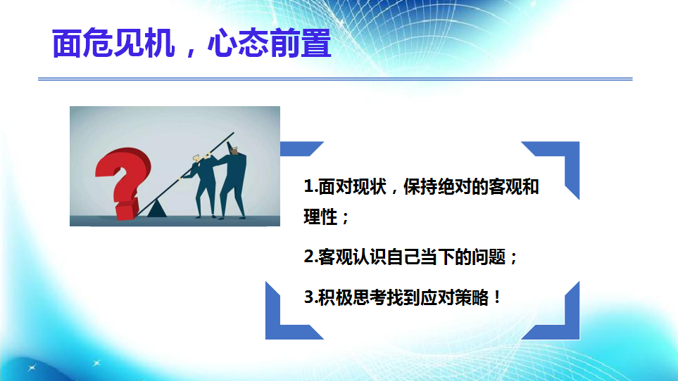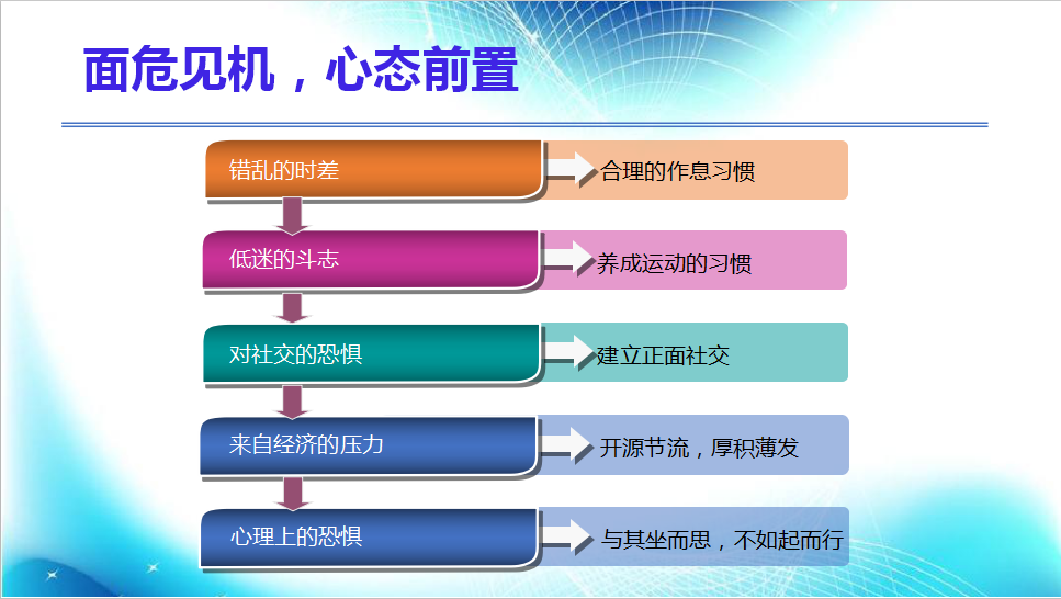 每個人要用一生的時間去修煉一種能力—抗壓能力。抗壓能力就是人們改變自己懼怕失敗、逃避行動的消極被動的行為習慣,擺脫挫敗、失落、無助的負面消極情緒,能回歸自我、堅定目標、敢于行動的能力。它可以幫助我們在面對焦慮、緊張時,保持絕對的客觀和理性,客觀認識自己當下的問題,并通過積極思考找到應對策略。