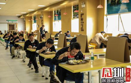 餐廳已經(jīng)見不到過去熱鬧的場景,員工們都按照地上間隔1米的“黃格子”保持著安全距離,全程沒有太多的交流。餐桌也被用擋板進(jìn)行隔離,一人一桌,同向就坐,就餐完畢還有餐廳員工對桌面進(jìn)行消殺。