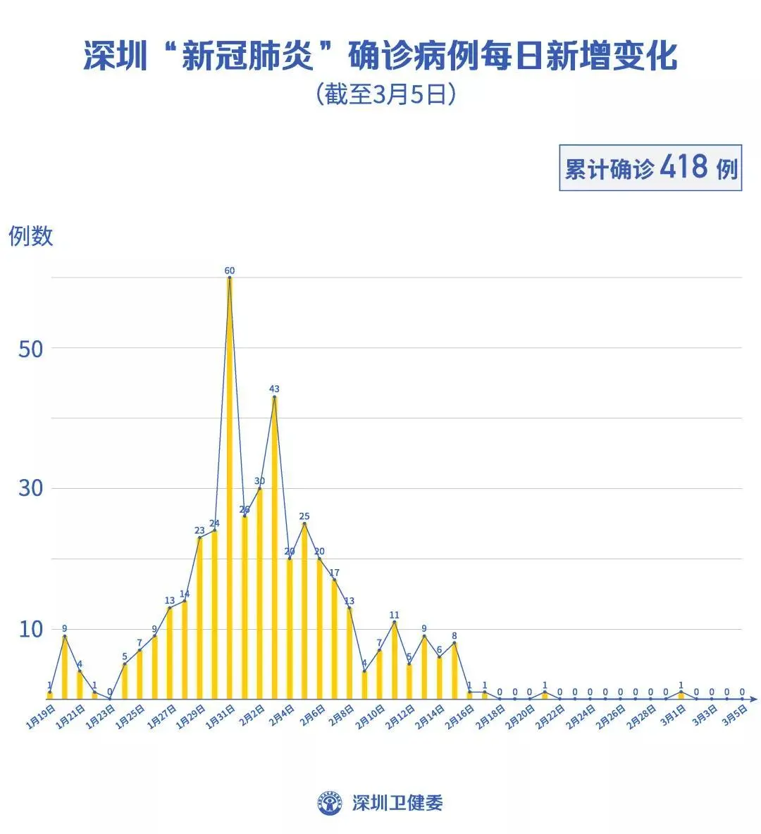 截至3月5日24時,深圳累計報告“新冠肺炎”確診病例418例。3月5日當天全市無新增確診病例,當天出院病例8例(從2月26日起不再公布出院個案)。 累計報告確診病例中,男性198例、女性220例。 按照病例管理地區(qū)劃分,南山區(qū)87例、福田區(qū)82例、龍崗區(qū)71例、寶安區(qū)62例、龍華區(qū)34例、羅湖區(qū)32例、光明區(qū)11例、坪山區(qū)7例、鹽田區(qū)6例、大鵬新區(qū)2例、其他(指由機場、車站、碼頭、關口、路卡等直接送往定點醫(yī)院的)24例。 目前,重癥4例、危重癥3例,死亡3例,累計出院358例。 57例確診病例均在深圳市第三人民醫(yī)院隔離治療。 97例密切接觸者正在接受醫(yī)學觀察。 資料來源:深圳市疾控中心、深圳市衛(wèi)健委、廣東省衛(wèi)健委