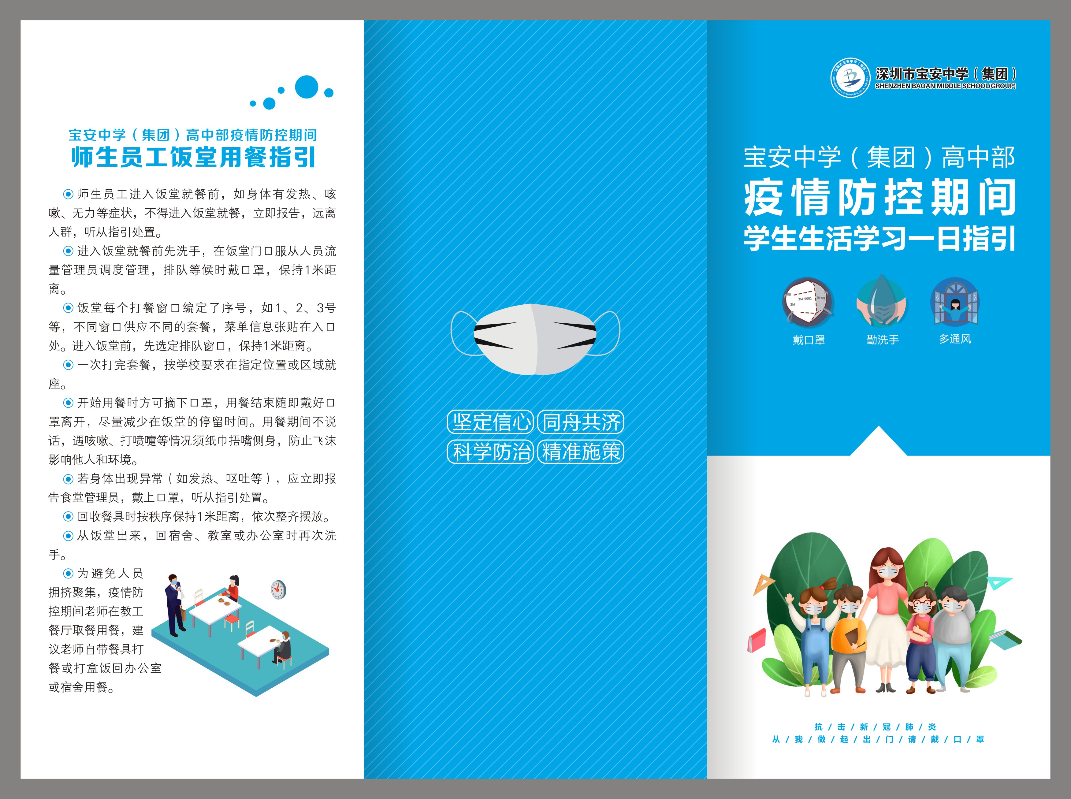 早在3月,返校復課的相關(guān)準備工作就已經(jīng)在緊鑼密鼓地推進中。為了規(guī)范師生返校復課各項措施和要求,在深圳市教育局發(fā)布復課防控疫情工作指引之前,彭鍛華就結(jié)合疫情形勢變化與學校實際,提出制定寶中集團的《學生學習生活一日指引》《教師工作生活一日指引》,對在校師生每天各個 時段 、各個 地點 的學習、工作和生活做出了明確指引。