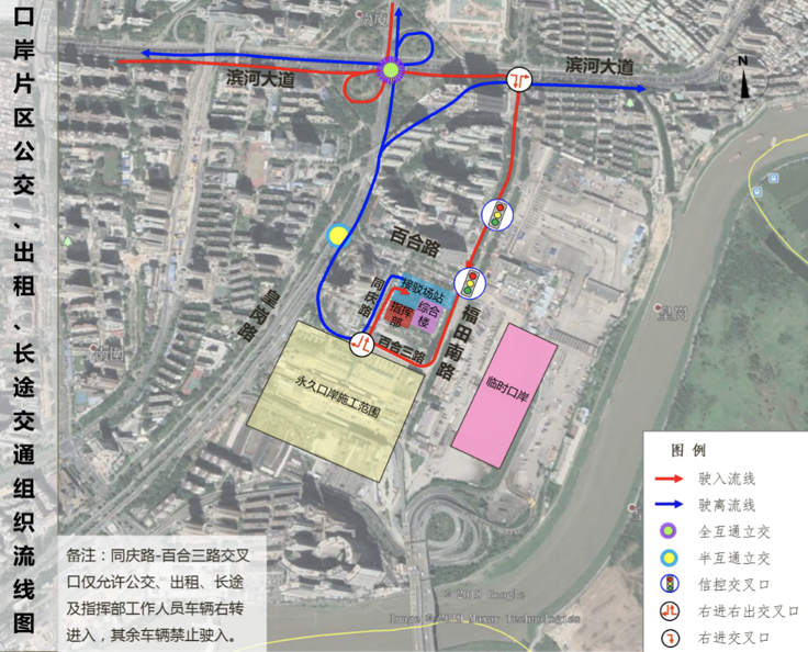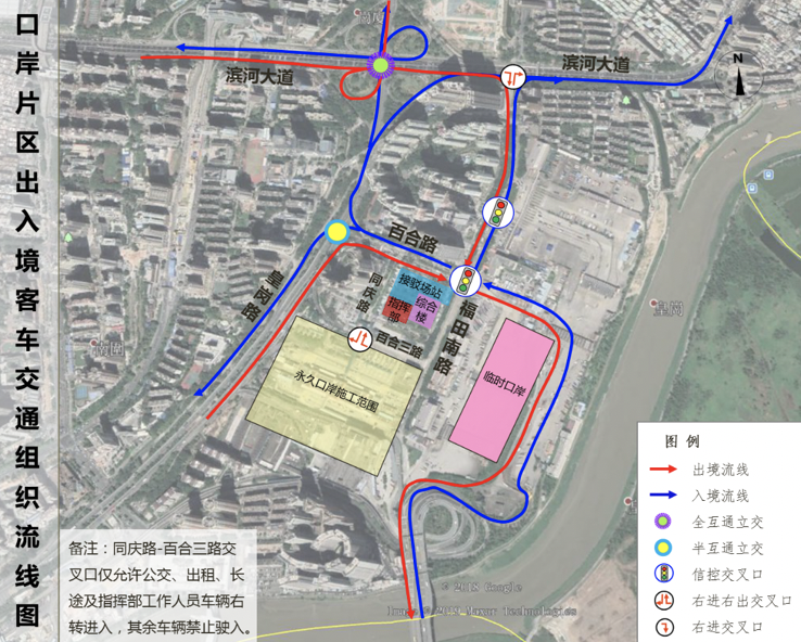 臨時(shí)口岸期間機(jī)動(dòng)車(chē)交通按照“流線順暢、客貨分離、人車(chē)分離”的原則進(jìn)行組織。主要利用口岸片區(qū)的皇崗路、百合路、福田南路、同慶路等進(jìn)行組織。各交通方式交通組織流線圖如下: