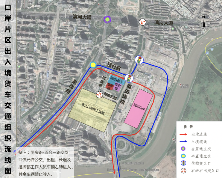 臨時(shí)口岸旅檢樓位于福田南路東側(cè),臨時(shí)交通接駁場(chǎng)站(公交場(chǎng)站、出租車(chē)場(chǎng)站、長(zhǎng)途客運(yùn)站)位于福田南路西側(cè)、百合路路南側(cè)。
