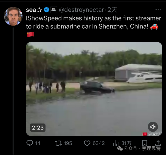 (IShowSpeed 創(chuàng)造了歷史,成為第一個(gè)在中國(guó)深圳乘坐潛水艇車的流量博主?。?/p>