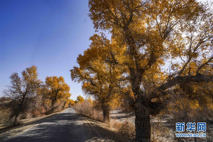 新疆尉犁縣胡楊林深處的一條小路(10月25日攝)。 10月中下旬,靜靜的塔里木河中下游一片金黃。胡楊深處,條條小路蜿蜒綿長(zhǎng)通向遠(yuǎn)方,引人入勝。 塔里木河是中國(guó)最長(zhǎng)的內(nèi)陸河,這一區(qū)域原始胡楊林分布較為集中。隨著塔里木河連續(xù)19次向下游生態(tài)輸水,為胡楊林“解渴”,塔河兩岸生態(tài)得到明顯改善,沙地面積逐年減少。 新華社記者趙戈攝