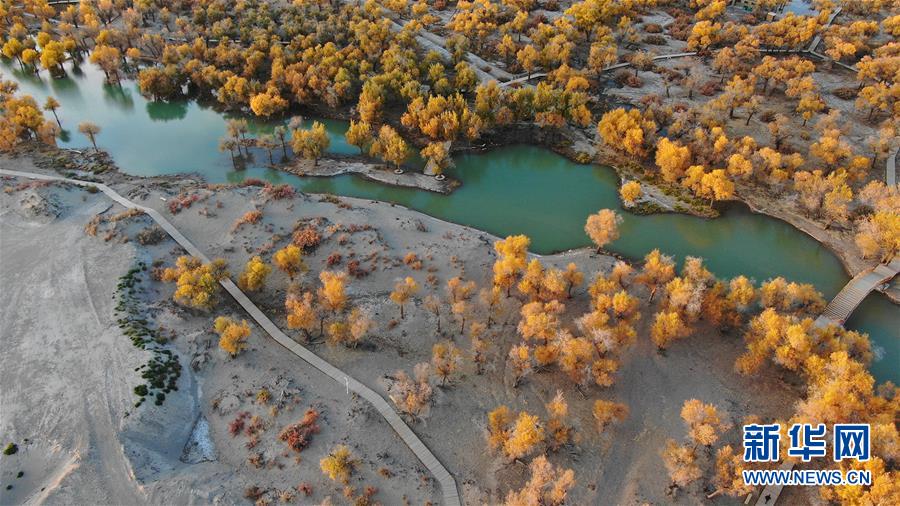 這是在內(nèi)蒙古自治區(qū)額濟(jì)納旗拍攝的胡楊林(10月10日無(wú)人機(jī)拍攝)。 金秋時(shí)節(jié),內(nèi)蒙古自治區(qū)額濟(jì)納旗胡楊林如同披上金裝,成為大漠中的一抹亮色,吸引眾多中外游客前來(lái)觀賞游玩。 新華社記者鄒予攝