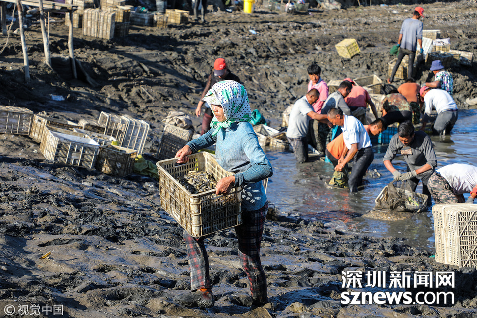深圳新聞網(wǎng)訊 2018年9月8日,遼寧丹東,早上5點,挖蟶人紛紛下到各個池子,要在海水海泥里艱辛勞作10小時,直至下午3點集體上岸,等待買家的運輸車隊運走他們的勞動成果。9月初,遼寧沿海養(yǎng)殖區(qū)進入養(yǎng)殖海鮮的收獲季。在東港,常常出現(xiàn)數(shù)百人乃至上千人集結(jié)在池子里挖蟶子(這里特指縊蟶,即東港當?shù)厝怂f的小人仙。下同)的壯觀景象。在養(yǎng)殖海鮮的收獲季,成群的海鷗趁機“助陣“,人與大自然和諧共處的畫面令人嘆為觀止。