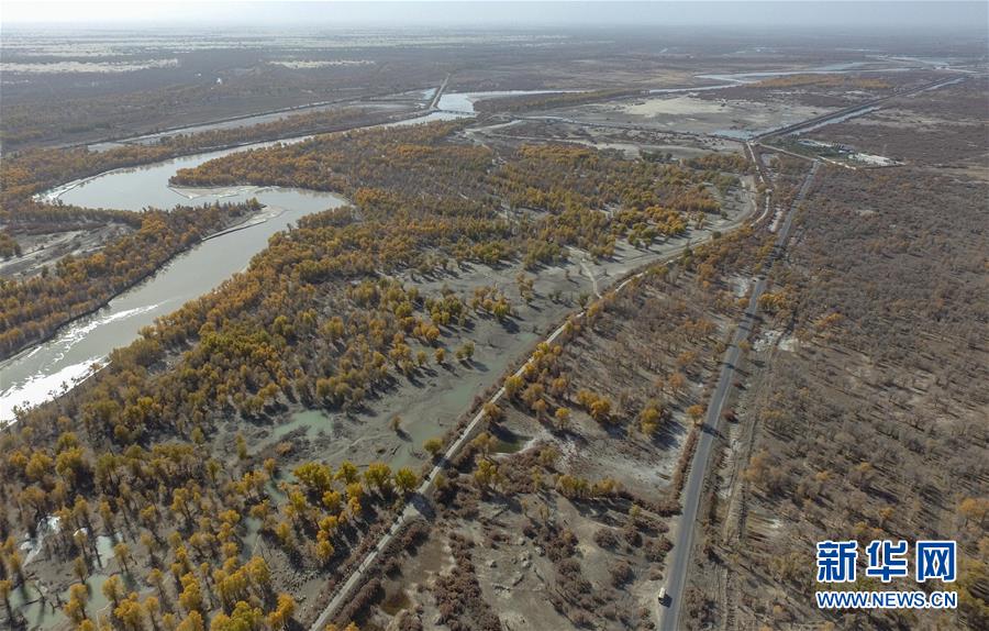 從空中俯瞰新疆尉犁縣喀爾曲尕鄉(xiāng),兩條道路沿著塔里木河岸邊的金色胡楊向前延伸(10月25日無人機拍攝)。 10月中下旬,靜靜的塔里木河中下游一片金黃。胡楊深處,條條小路蜿蜒綿長通向遠(yuǎn)方,引人入勝。 塔里木河是中國最長的內(nèi)陸河,這一區(qū)域原始胡楊林分布較為集中。隨著塔里木河連續(xù)19次向下游生態(tài)輸水,為胡楊林“解渴”,塔河兩岸生態(tài)得到明顯改善,沙地面積逐年減少。 新華社記者趙戈攝