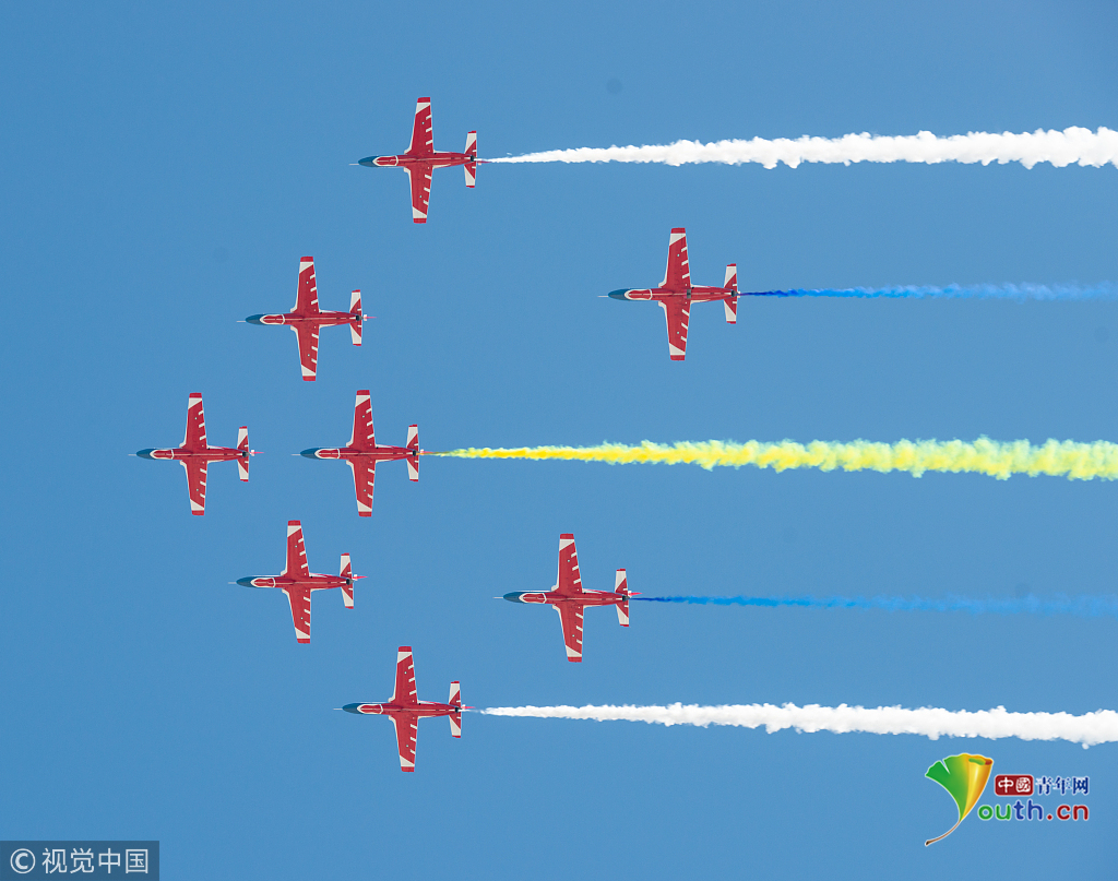 2018年11月8日,廣東珠海,第十二屆中國國際航展第三天??哲姟鞍艘弧憋w行表演隊的隊員們,發(fā)揚連續(xù)作戰(zhàn)精神,給觀眾們表演了七機分組開花、四機編隊橫滾等高難動作,受到觀眾們的稱贊。視覺中國