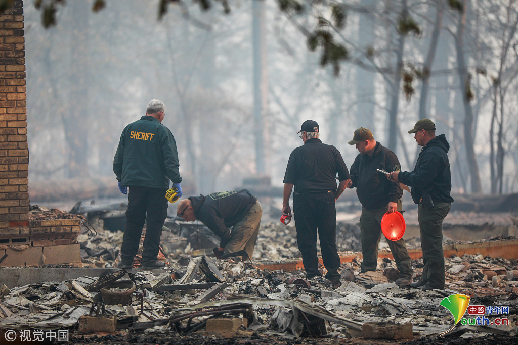 當(dāng)?shù)貢r間2018年11月10日至11月11日,美國加州Paradise,當(dāng)?shù)厣交鹚僚?,治安官們在?zāi)區(qū)搜尋遇難者遺體。圖片作者:Gabrielle Lurie