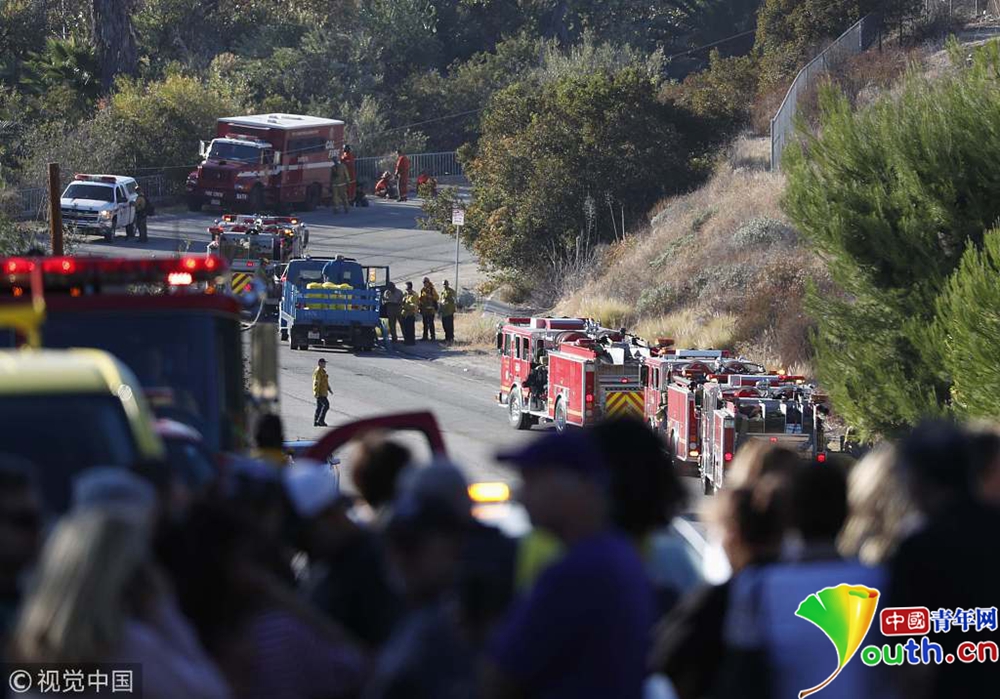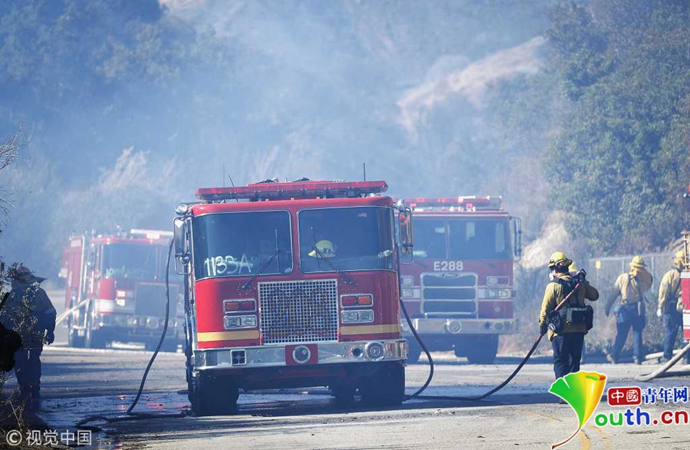 該郡第二大城市千橡樹市(Thousand Oaks)等很多地方房屋被毀,高速公路封閉,居民緊急疏散。洛杉磯郡圣蓋博市(San Gabriel)警察局警官日瓦戈(O. Zhivaga)和同事們當(dāng)天清晨即受命馳援文圖拉郡,保護當(dāng)?shù)鼐用窈拓敭a(chǎn)安全。圖為消防車行駛在已封閉的公路上,天空中濃煙滾滾。