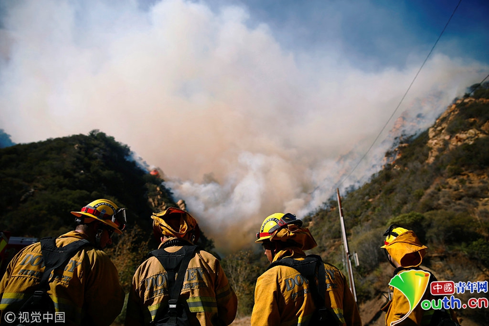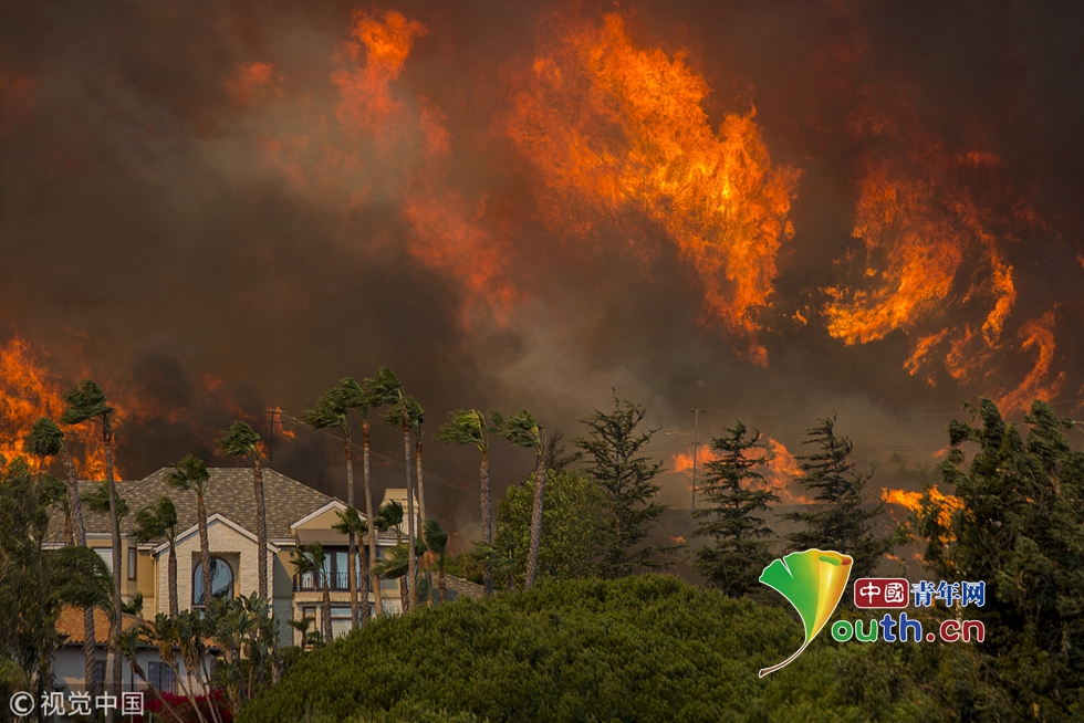 山火迅速蔓延至剛剛發(fā)生槍擊案的千橡樹市,并在9日翻過圣莫妮卡山,在強風(fēng)的助力下向海邊蔓延。