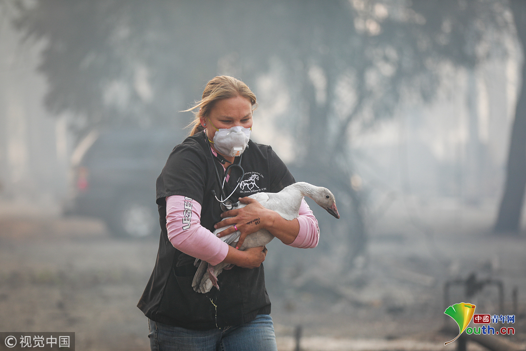 當(dāng)?shù)貢r間2018年11月10日,美國加州Paradise,當(dāng)?shù)厣交鹚僚?,?zāi)區(qū)民眾紛紛帶領(lǐng)家畜進行轉(zhuǎn)移。自本周三開始,加州多地發(fā)生山火,火勢蔓延迅猛,數(shù)萬人被迫撤離,數(shù)以萬計的房屋被燒毀。圖片作者:Jessica Christian