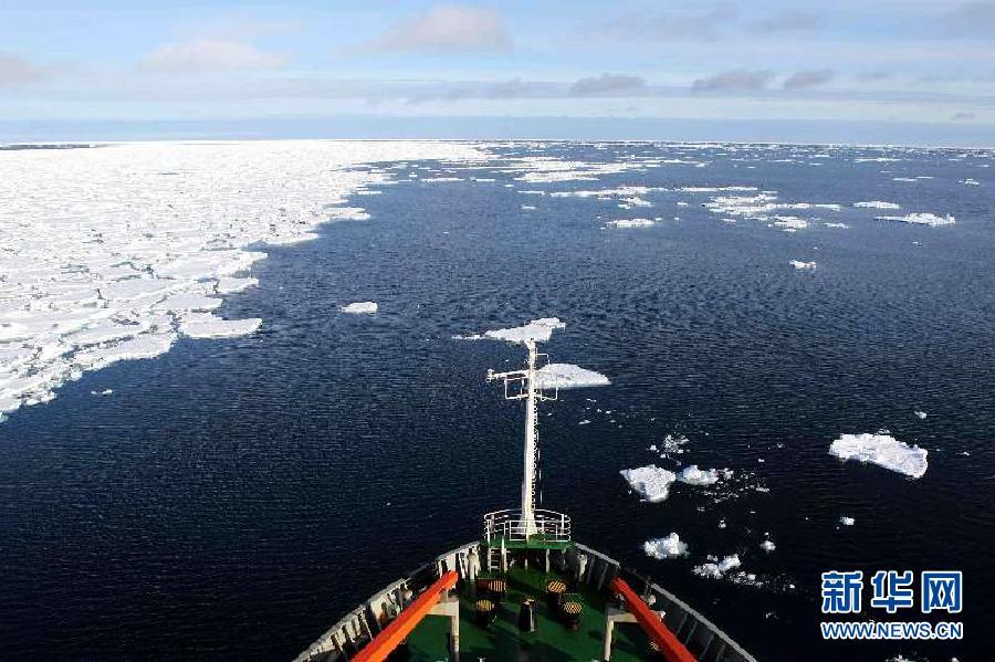 從“雪龍”號駕駛臺上放眼望去,浮冰鋪滿海面,時有冰山立于其間?!把垺碧栄刂”g的空隙行進,碾過浮冰的撞擊聲不時從船底傳來。為減輕船體的震動,航速有所下降,由原來的每小時15節(jié)左右降為目前的每小時9節(jié)左右(1節(jié)約合每小時航行1.852公里)。