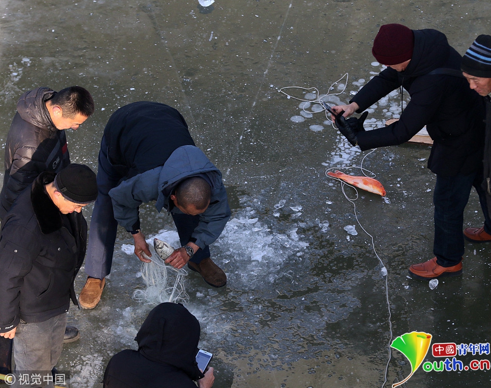 哈爾濱松花江封江 市民鑿冰捕魚(yú)